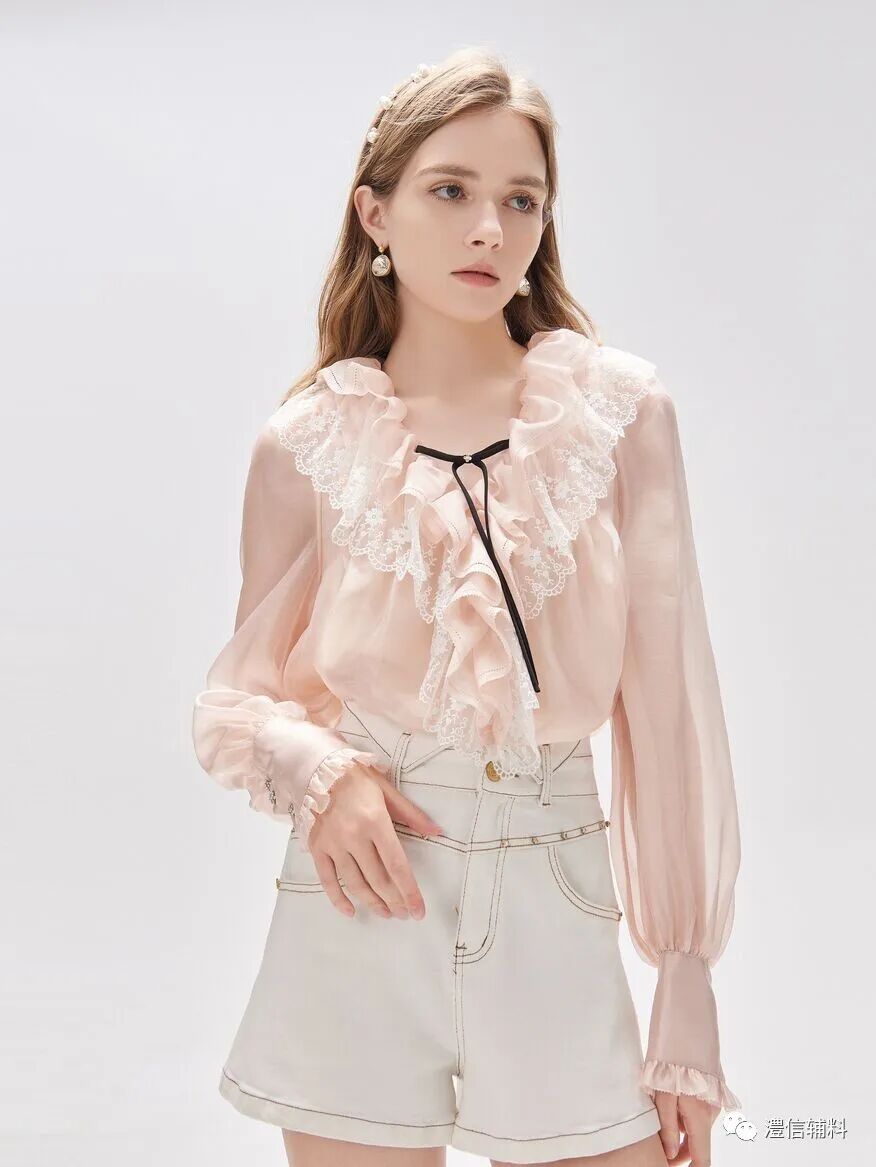 将袖子、领子、下摆等部位拼接精美的蕾丝花边为款式注入更多甜美感,针织打底衫袖子表面附加蕾丝面料给款式带来更为梦幻朦胧之感,衬衫下摆一体式激光切割蕾丝花边或毛织打底衫精美定制的蕾丝领子,都给款式带来更高级的质感。